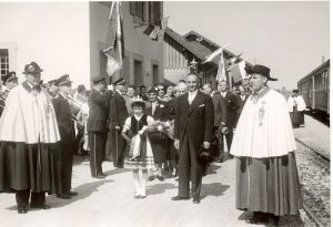 Arrivée de Jämes Berlie à la gare de Crassier lors de son élection à la présidence du Grand Conseil Vaudois